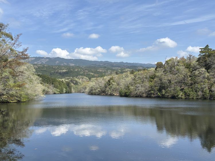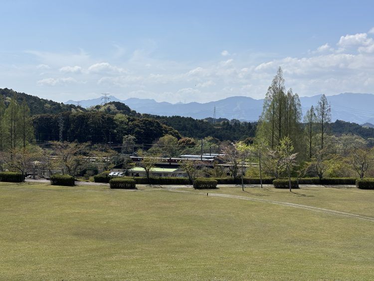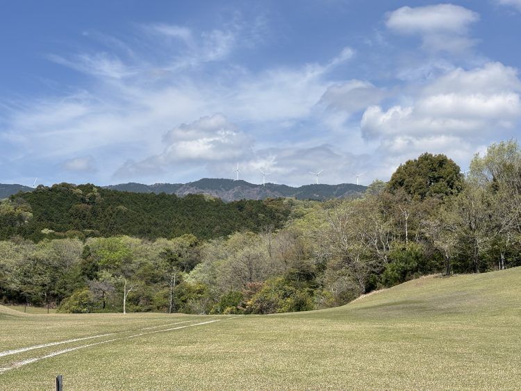 園内の芝生広場はきれいに整備しており、バックに写る青山高原の風車風景と見事にマッチしたロケーションとなっています。惣谷池からの眺めも最高です。
